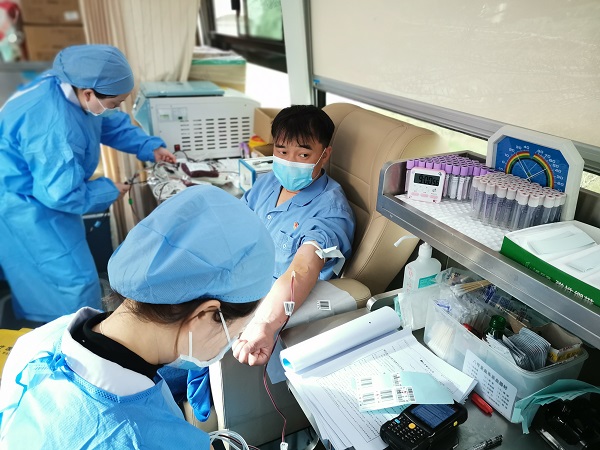 填表、登記,量血壓、戴鞋套,馬向軍輕車熟路地走上獻血車,兒子則小心翼翼地緊跟著父親。聽到體檢過關(guān)可以獻血的時候,馬明昊緊張的心情終于放松了。“我爸是個資深獻血者了。而我是第一回,就害怕體檢環(huán)節(jié)出現(xiàn)問題?!瘪R明昊告訴筆者,為了首次獻血成功,他是做足了功課的,包括作息、飲食還有身體鍛煉。當父子倆從獻血車上走下來時,馬明昊露出了滿足的笑容。“雖然沒有圓自己疫情防控志愿者的夢,但今天與渭化員工拼團獻血,也算是換種方式戰(zhàn)‘疫’了。’”